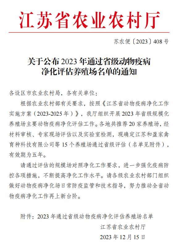 12月15日,江蘇省農(nóng)業(yè)農(nóng)村廳發(fā)布省級(jí)動(dòng)物疫病凈化場(chǎng)名單蘇農(nóng)便〔2023〕408 號(hào),我司瑞鵬牧業(yè)經(jīng)專家評(píng)審,被評(píng)為省級(jí)羊布魯氏菌病凈化場(chǎng)。